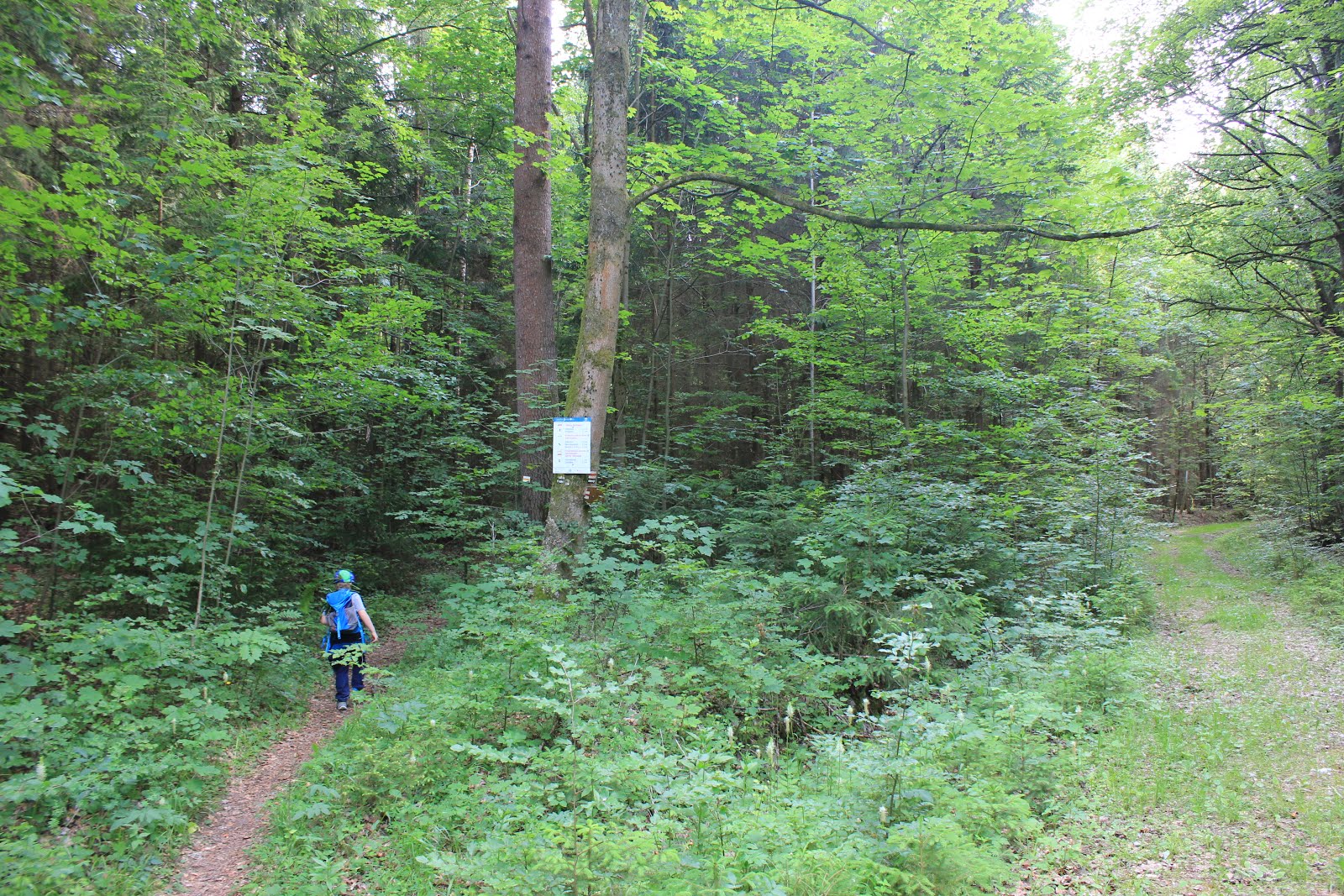über einen Waldweg, bis Ihr links in einen breiten Schotterweg