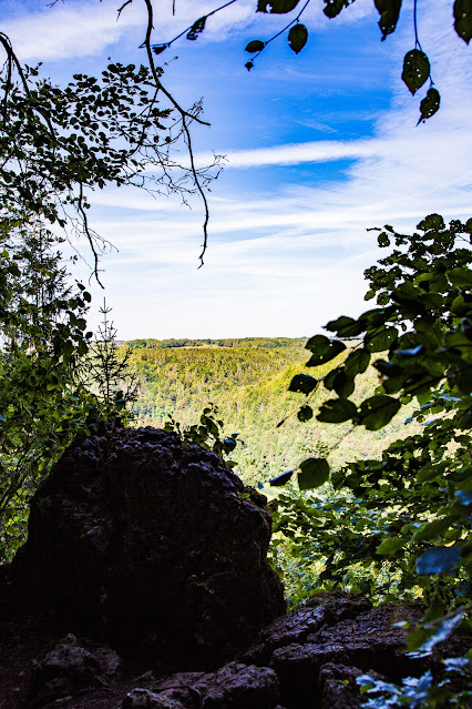 Von der Brille kehrt ihr zum Weg zurück, geht kurz nach rechts und folgt dann dem erwähnten, unmarkierten Weg nach rechts unten. Er trägt euch in ein Felsental, angefüllt mit bizarren Türmen und schroffen Wänden. Der Weg führt euch aus dem Wald, an dessen Rand entlang und mündet in einen Schotterweg, dem ihr, weiterhin ohne Wanderzeichen, nach rechts folgt. Nach 150 Metern gelangt ihr mit dem Schotterweg an eine Kreuzung. Hier trefft ihr auf das letzte Wanderzeichen eurer heutigen Wanderung. Der Rote Ring führt euch nach links in den Wald und zuerst einmal zum Aussichtspunkt Wiesenttalblick. Zugegeben, außer baumgrünen Hängen und Straße tief unter euch gibt es hier kaum etwas zu sehen. Doch dafür sind der Felssporn des Aussichtspunktes und der Pfad, der dorthin führt, recht ansehnlich.